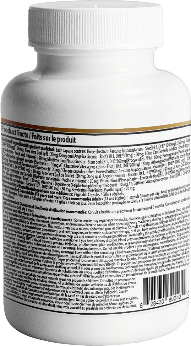 Arterial Venous Capsule - For comprehensive arterial and venous support, a blend of potent natural ingredients can offer significant benefits in promoting vascular health. Aesculus hippocastanum (horse chestnut) is well-known for its ability to improve venous tone and reduce swelling in the legs. Allium sativum (garlic) supports healthy blood flow and has been shown to lower cholesterol levels, contributing to overall cardiovascular health. Aloe vera provides anti-inflammatory benefits, which can enhance circulation and promote vascular integrity. Angelica sinensis (dong quai) is traditionally used to support blood circulation and may help in maintaining healthy blood vessels. Centella asiatica is recognized for its role in enhancing venous health and reducing capillary permeability. Hydrastis canadensis (goldenseal) has antimicrobial properties that can aid in maintaining healthy blood vessels. Pinus pinaster (French maritime pine bark) offers antioxidant support, helping to protect vascular tissues from oxidative damage. Punica granatum (pomegranate) is rich in antioxidants and has been linked to improved arterial health. Vitamin E acts as a powerful antioxidant that protects cell membranes, promoting overall vascular health. Vitex agnus-castus (chaste tree) may help regulate hormone balance, which can indirectly support vascular function. Withania somnifera (ashwagandha) is an adaptogen that helps the body manage stress, further supporting cardiovascular health. Lastly, trans-Resveratrol, a powerful antioxidant found in grapes, has been shown to promote healthy circulation and support arterial function. By integrating these ingredients into a holistic approach to arterial and venous support, it can enhance outcomes related to vascular health and well-being.
